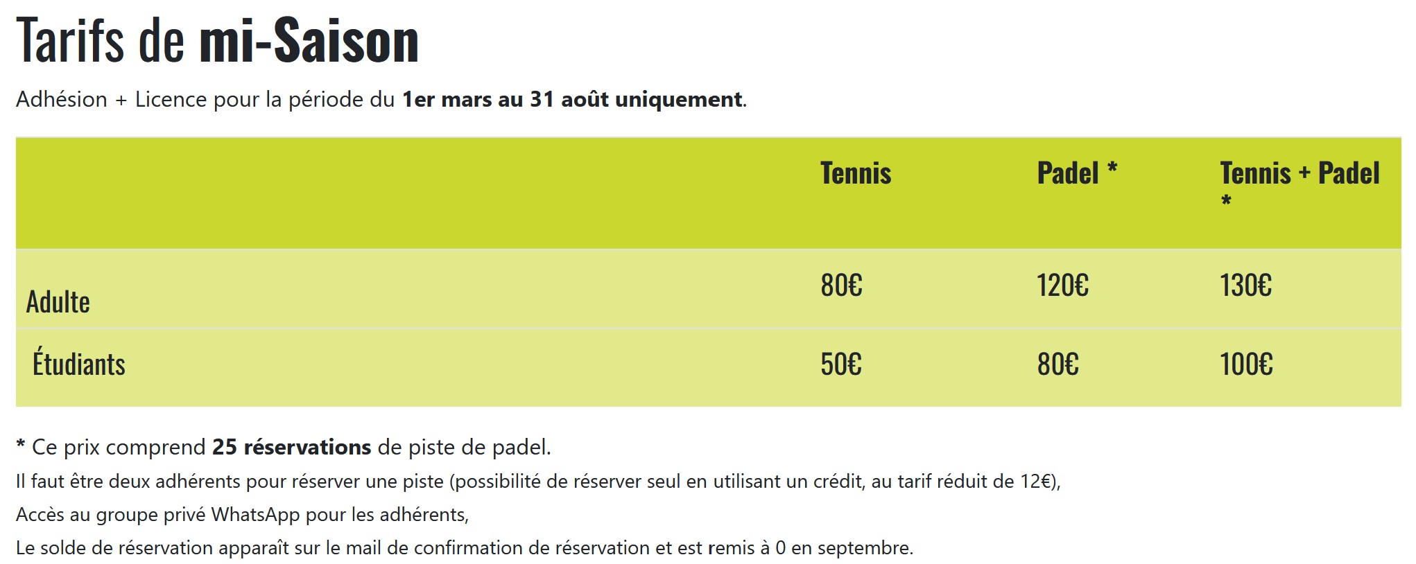 Tarifs mi-saison tennis et padel, c'est parti !